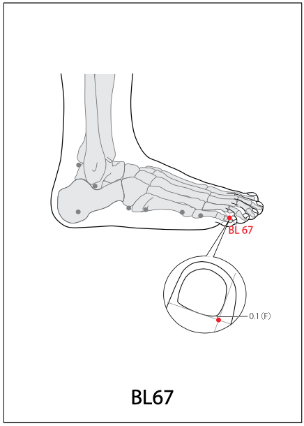 Location: On the little toe, lateral to the distal pha- lanx, 0.1 finger-cun proximal to the lateral corner of the toenail; at the intersection of the vertical line of the lateral side of the nail and the horizontal line of the base of the toenail.