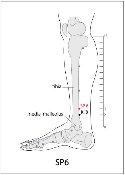 Location: On the tibial aspect of the leg, posterior to the medial border of the tibia, 3 body-cun superior to the prominence of the medial malleolus.